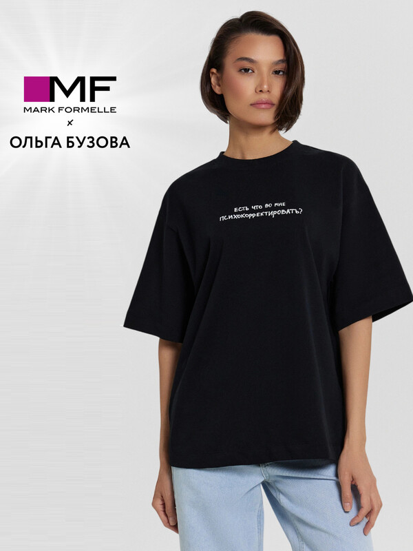 Футболка женская Mark Formelle x Ольга Бузова. Лимитированная коллекция "Мне можно все". Стильный и удобный вариант для любого повседневного гардероба! Изготовленная из мягкой и приятной кулирки, она обеспечивает комфорт и воздухопроницаемость, делая ее идеальной для теплых дней. Круглая горловина обработана обтачкой из рибаны, что добавляет аккуратности и завершенности дизайну. Спущенная линия плеча и короткие рукава создают расслабленный и современный образ, идеально подходящий для повседневных нарядов. Нижние края футболки и рукавов обработаны швом вподгибку, что обеспечивает долговечность и ухоженный вид. Такая футболка станет универсальным выбором, гармонично вписываясь в ваш гардероб и подчеркивая непринужденный стиль. Рекомендуем!