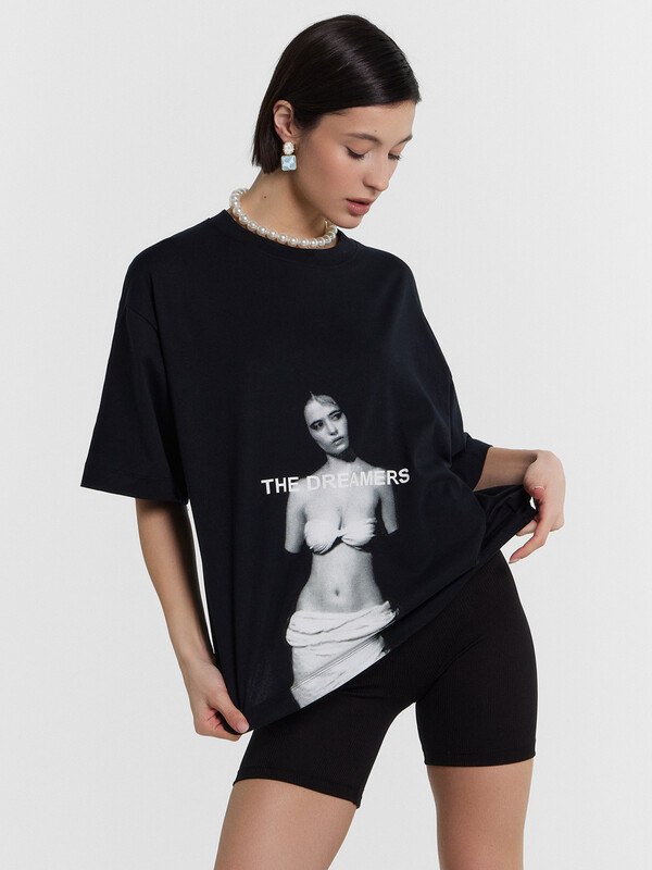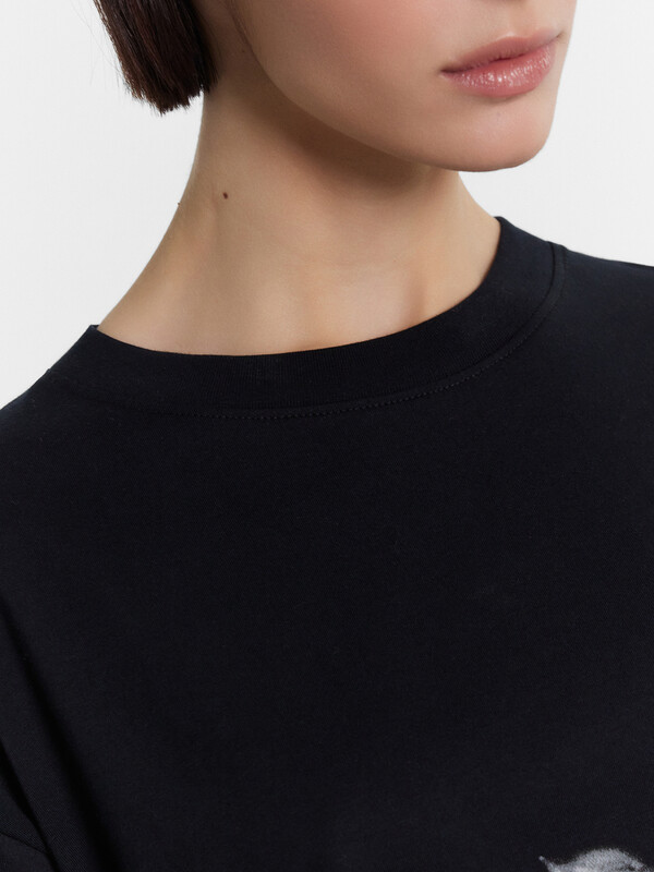 Нижние срезы футболки и рукавов обработаны швом вподгибку.