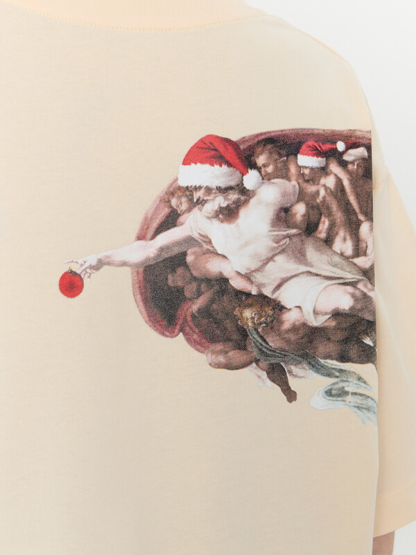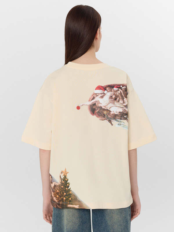 Свободный оверсайз крой со спущенным плечом и короткими рукавами формирует лёгкий и актуальный силуэт. Горловина отделана эластичной рибаной для удобной посадки. Все края аккуратно обработаны, что подчеркивает качество пошива и обеспечивает долговечность.