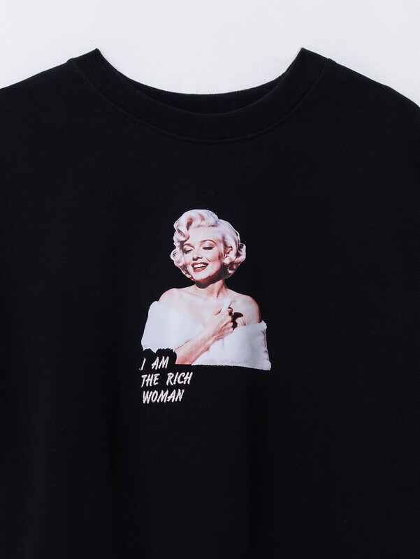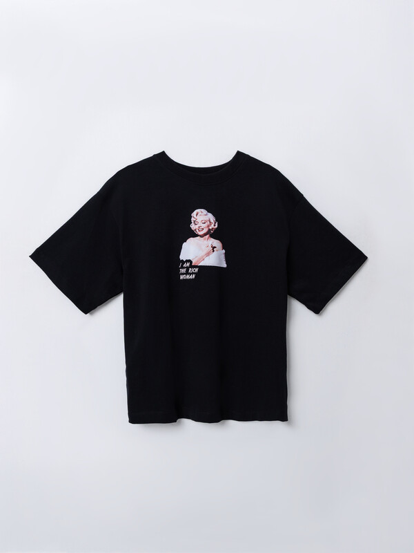 Нижние срезы футболки и рукавов обработаны швом вподгибку.