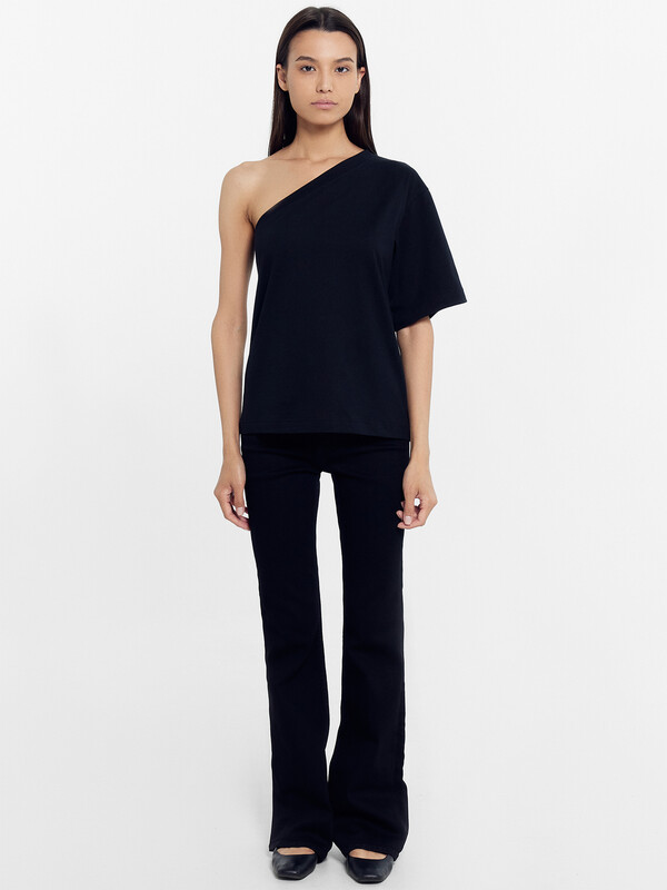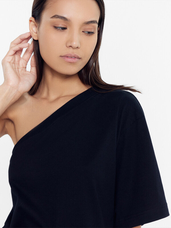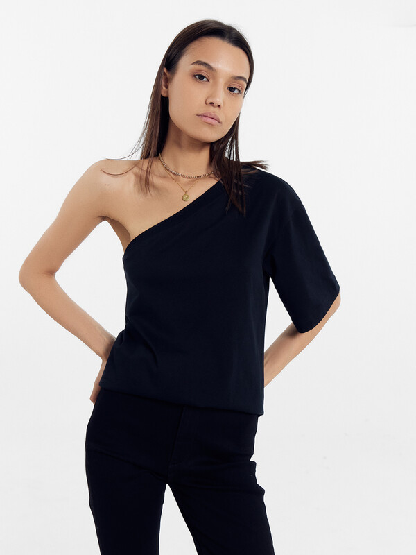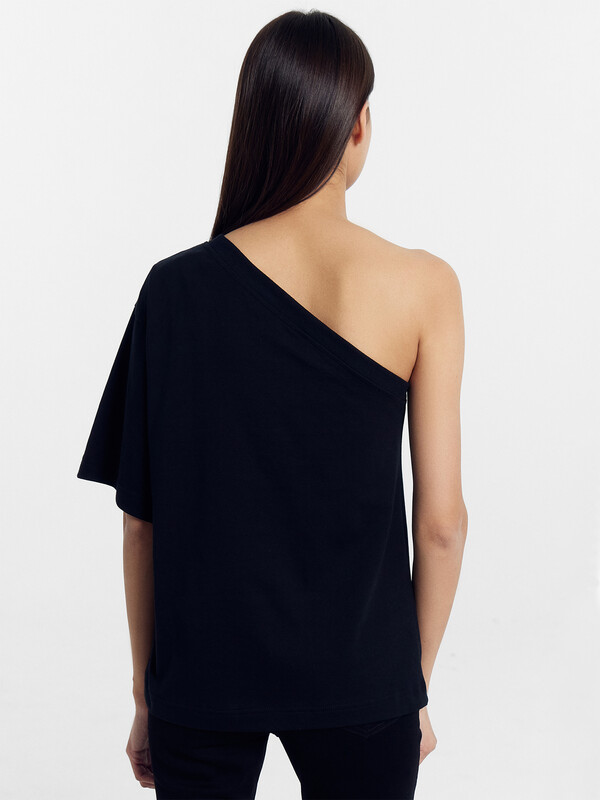 Горловина асимметричной формы, вырез на одно плечо. Обтачка верхнего среза из рибаны. Плечо слегка спущено, пройма углублена. Рукав втачной, длиной по локоть.