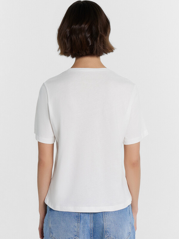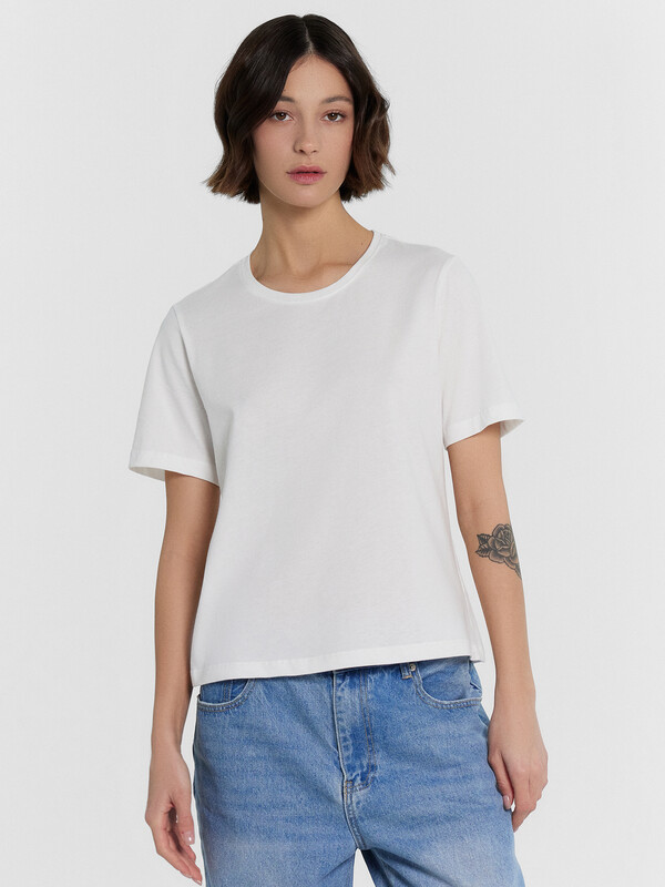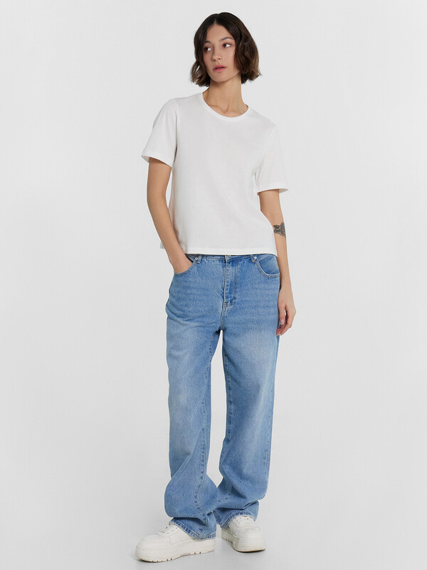 Футболка прямого силуэта. Горловина круглой формы обработана обтачкой из основного полотна. Рукава втачные, корткие. Нижние срезы футболки и рукавов обработаны швом вподгибку.