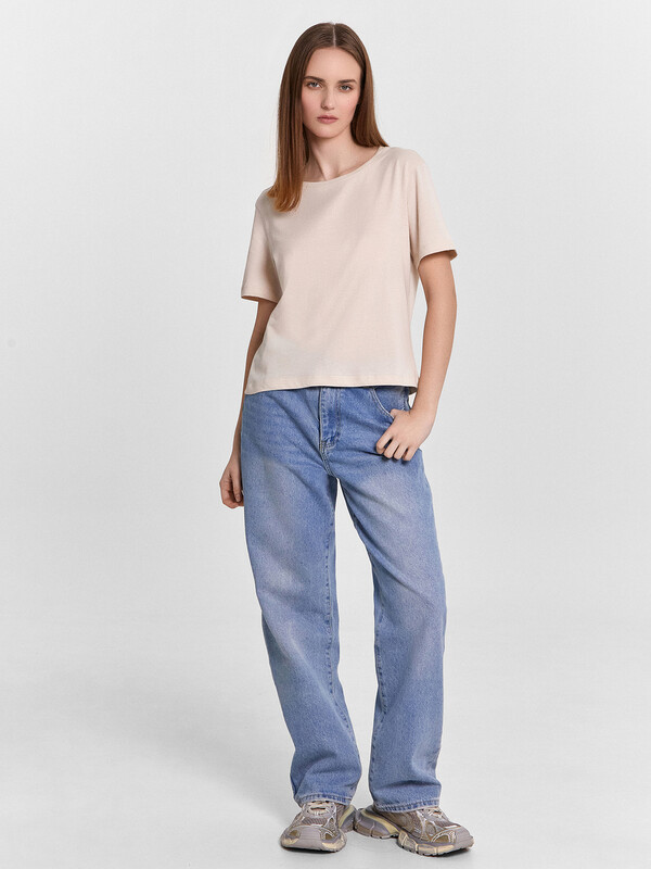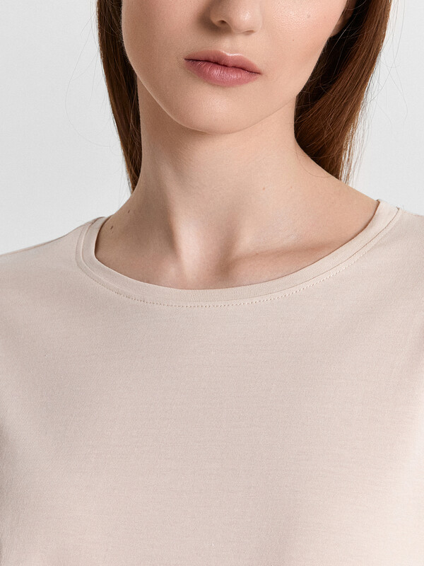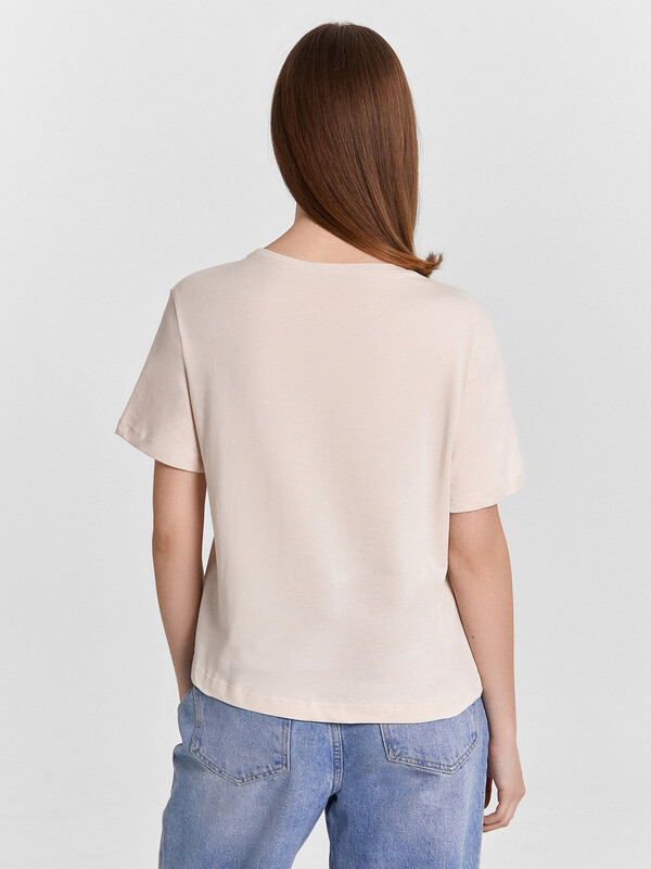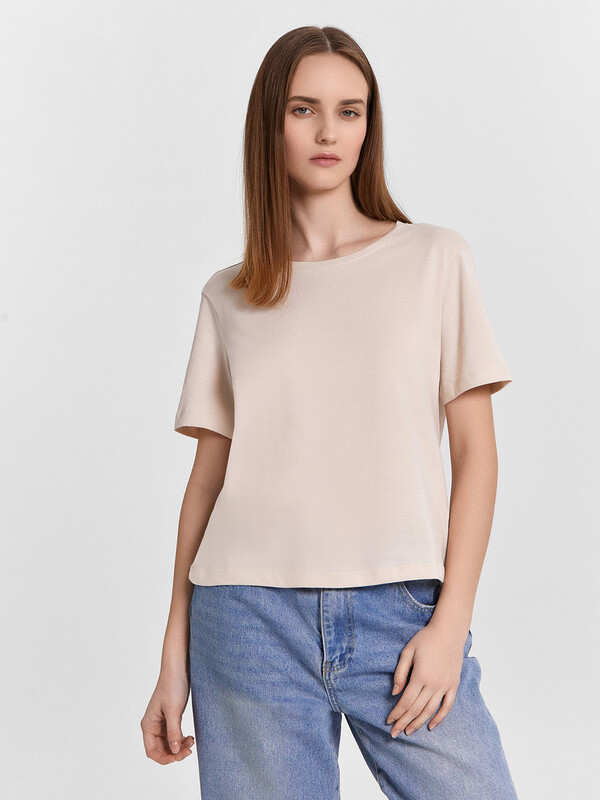 Футболка прямого силуэта. Горловина круглой формы обработана обтачкой из основного полотна. Рукава втачные, корткие. Нижние срезы футболки и рукавов обработаны швом вподгибку.