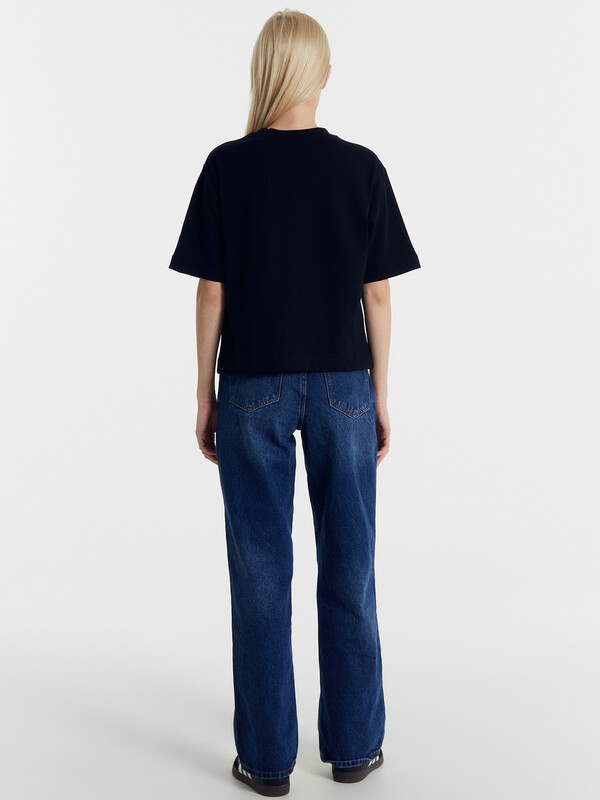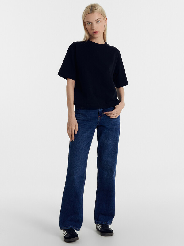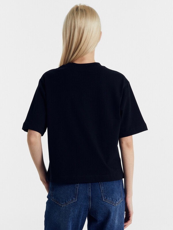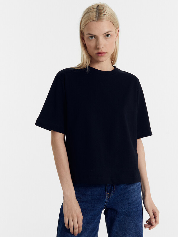 Нижние срезы футболки и рукавов обработаны швом вподгибку.