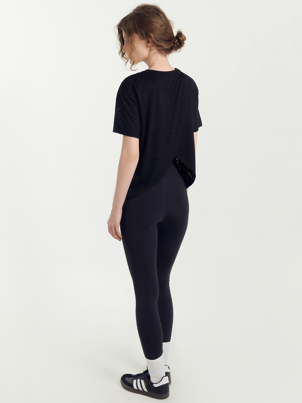 Нижний срез футболки и рукавов обработан швом вподгибку.