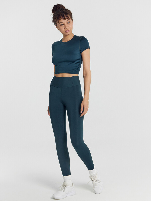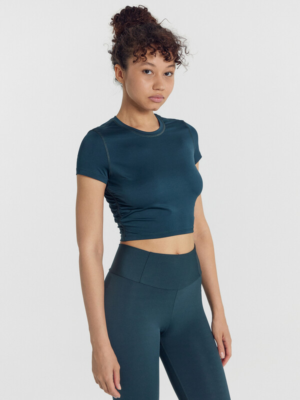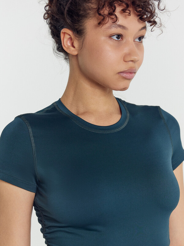 Футболка присборена по боковым швам.