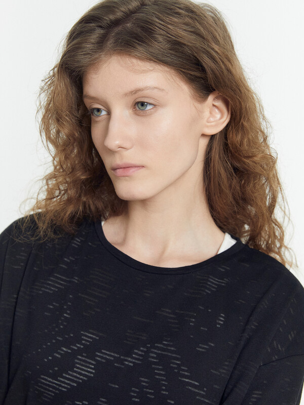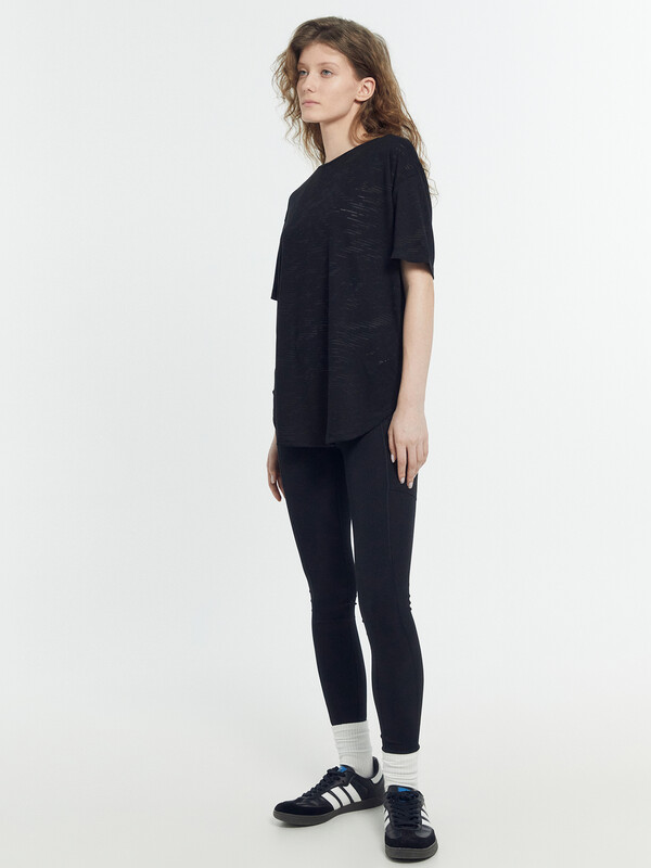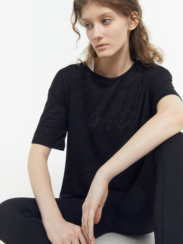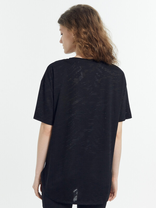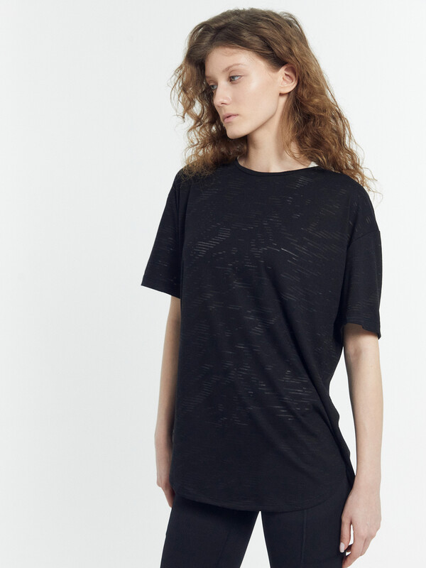 Нижний срез футболки и рукавов обработан швом вподгибку.
