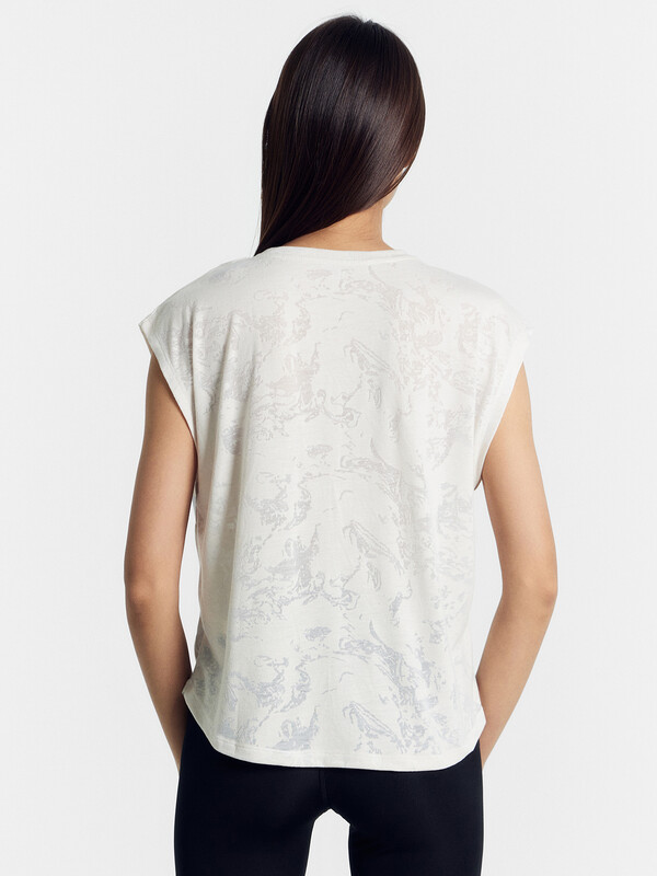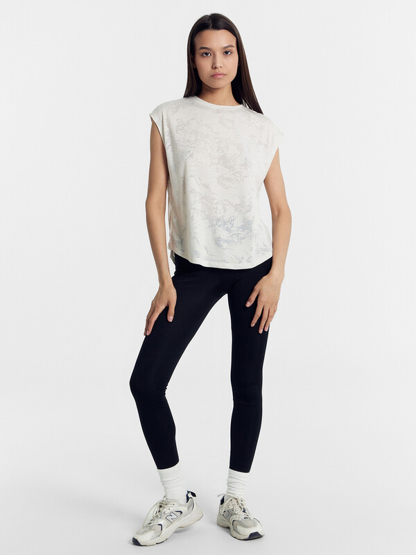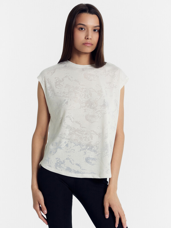 Футболка прямая, свободная.Горловина округлой формы, обработана обтачкой из основного полотна.