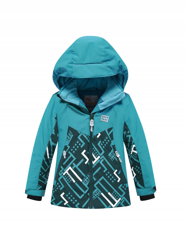 Детский зимний костюм включает в себя куртку прямого кроя с комбинированным дизайном и однотонные горнолыжные брюки.