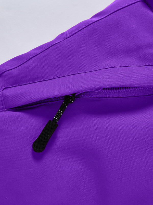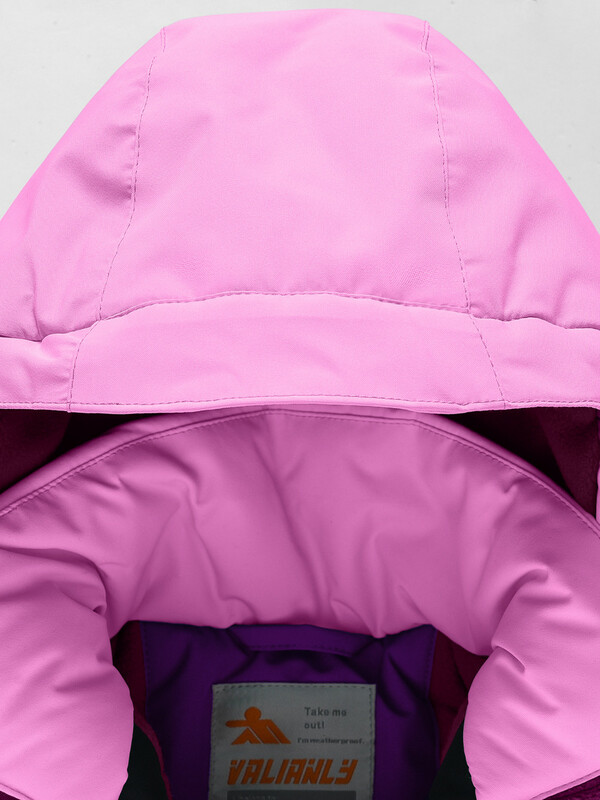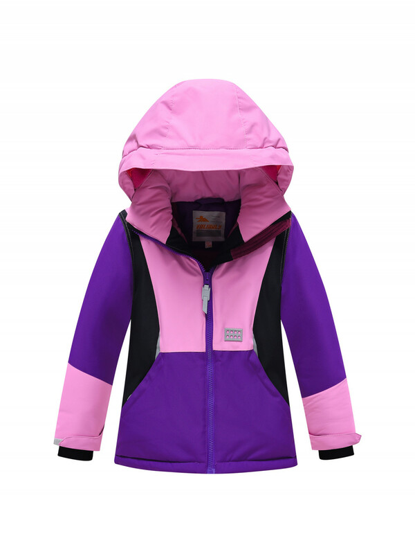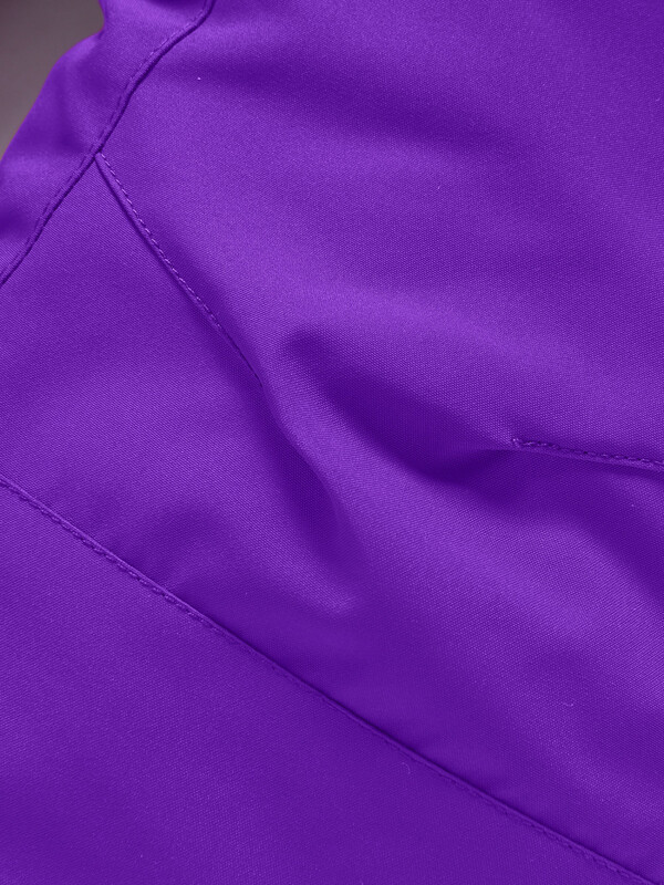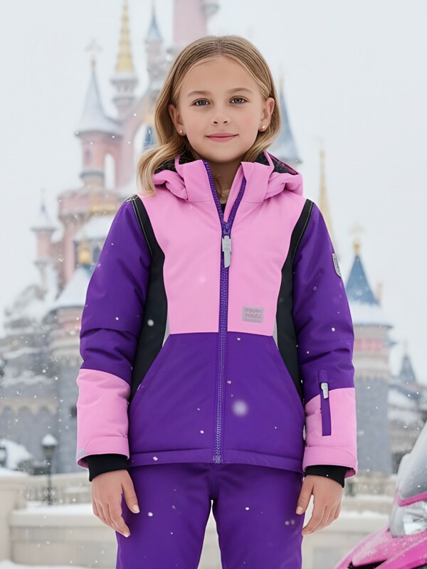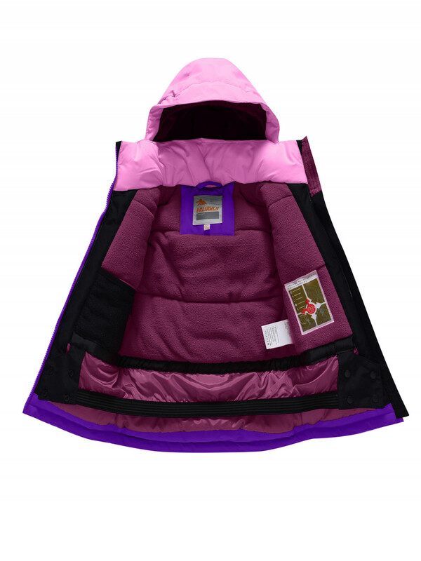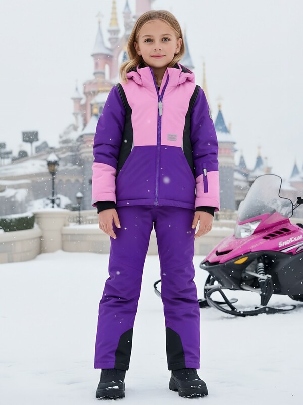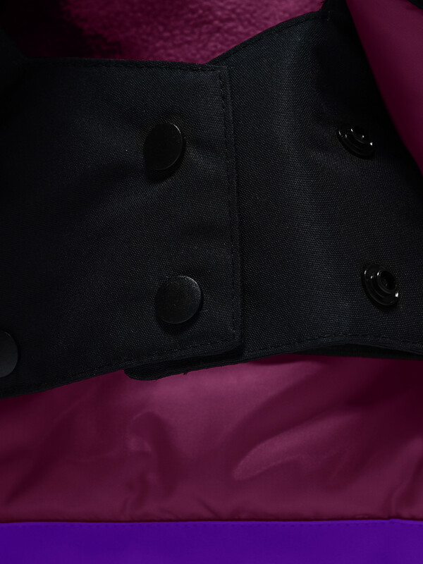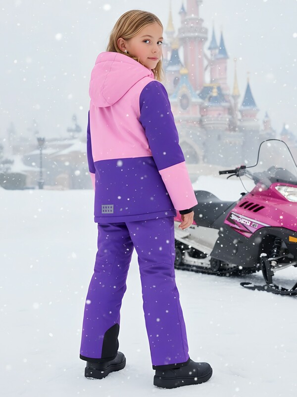 Горнолыжный костюм для девочек состоит из куртки и полукомбинезона. Куртка, до середины бедра, имеет съемный капюшон, высокий воротник стойку, прямые рукава фиксируются липучками, трикотажные эластичные манжеты плотно прилегают к кистям. Боковые карманы на молнии. Внутри накладной кармашек. Застегивается куртка на молнию. Верхняя часть воротника защищает подбородок от натирания. Подкладка из флиса и полиэстера. Снегозащитная юбка на кнопках.