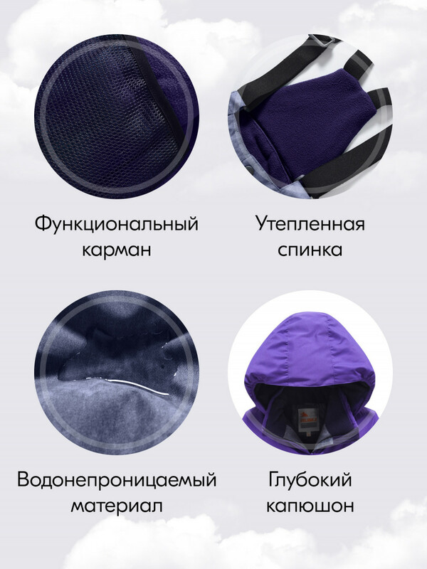 Состав комплекта: Капюшон, Куртка, Подтяжки, Полукомбинезон, Воротник