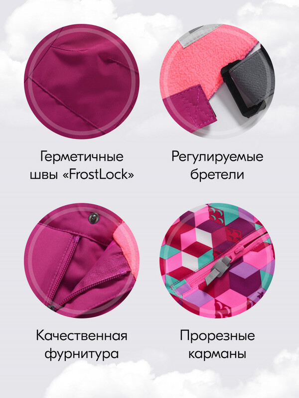 Брюки также продуманы до мелочей: съемные регулируемые бретели обеспечивают надежную посадку, а утепленная спинка гарантирует дополнительный комфорт.