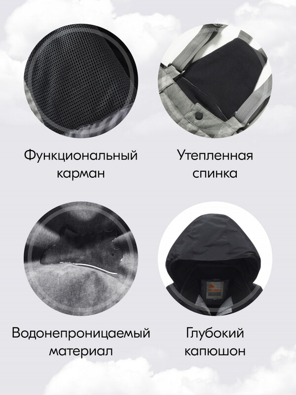 Состав комплекта: Капюшон, Куртка, Подтяжки, Полукомбинезон, Воротник