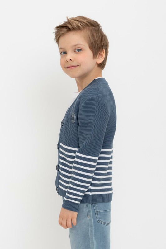 Вязаный кардиган в полоску для мальчика с втачными рукавами. Связан из хлопковой пряжи. На рукавах эластичные манжеты. Внизу мягкий пояс. Застёгивается на пуговицы.