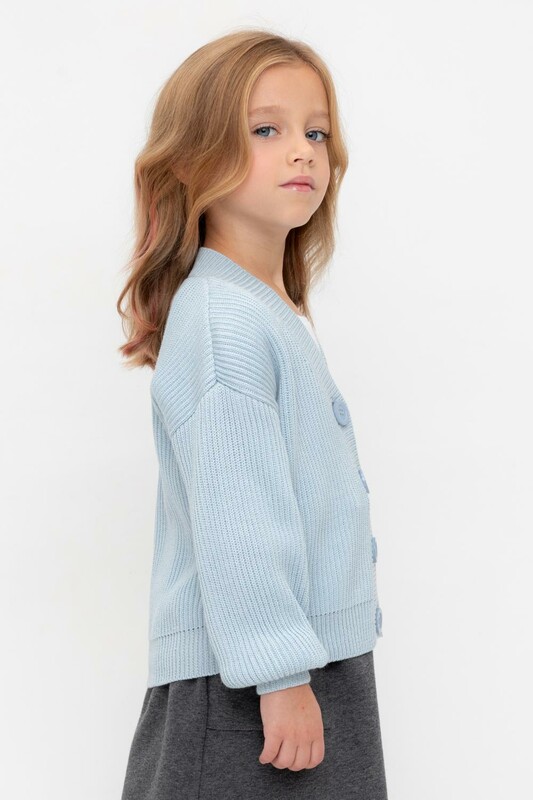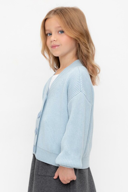 Вязаный кардиган для девочки со спущенными рукавами. Связан из хлопковой пряжи. На рукавах эластичные манжеты. Внизу мягкий пояс. Застёгивается на пуговицы.