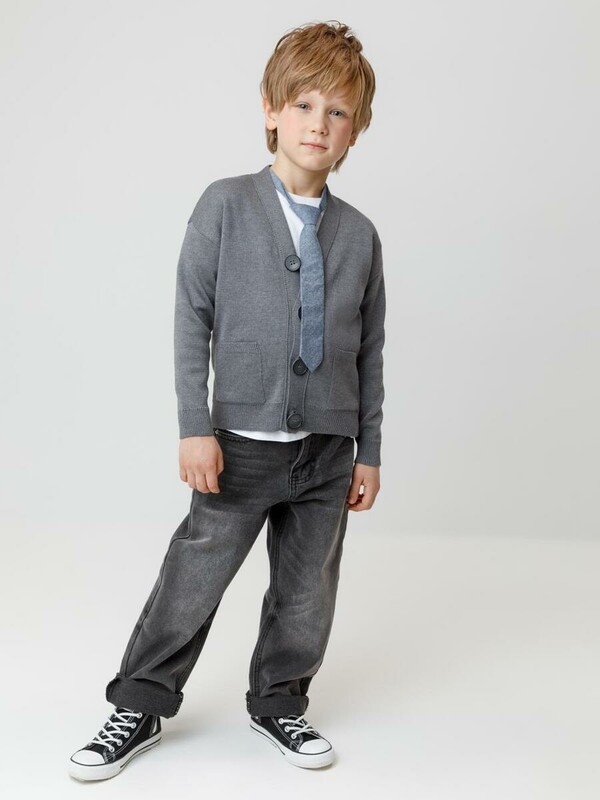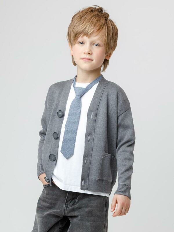 Вязаный кардиган для мальчика с карманами. Связан из хлопковой пряжи. На рукавах эластичные манжеты. Внизу мягкий пояс. Застёгивается на пуговицы.