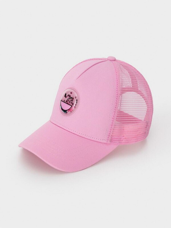 Кепка для девочки из текстиля и сетки. Спереди украшена оригинальной нашивкой с блёстками. Регулируется по ширине головы и фиксируется на затылке с помощью пластиковой застёжки.
