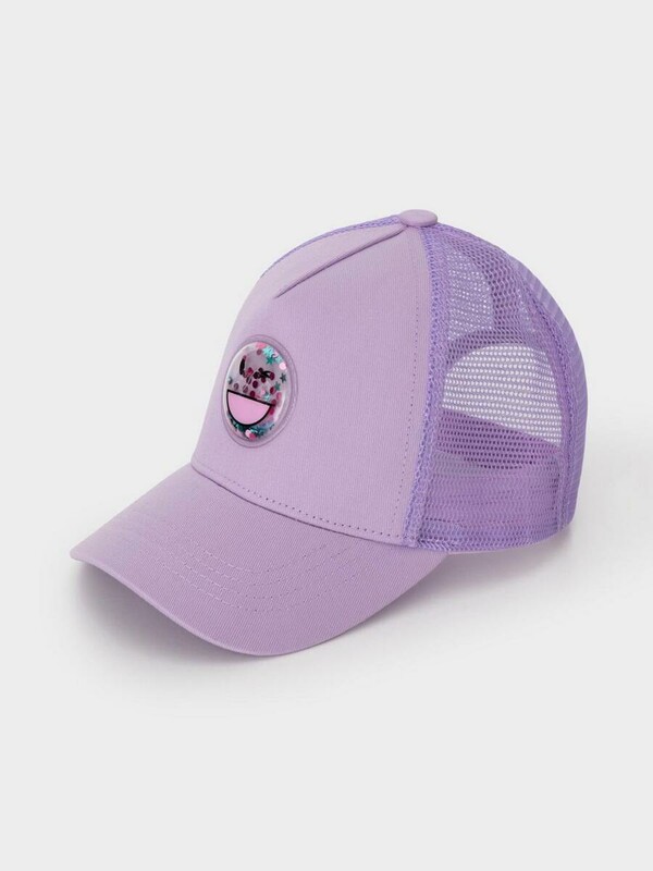 Кепка для девочки из текстиля и сетки. Спереди украшена оригинальной нашивкой с блёстками. Регулируется по ширине головы и фиксируется на затылке с помощью пластиковой застёжки.
