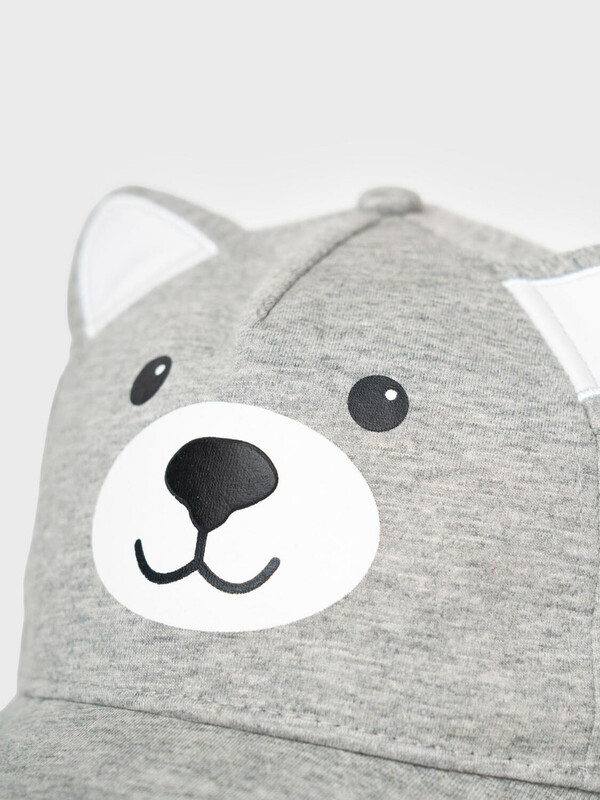 Детская бейсболка для мальчика. Выполнена из мягкого хлопкового трикотажного полотна. Классическая форма с изогнутым козырьком. Главная особенность дизайна — лицо животного на передней части и объёмные ушки, пришитые сверху. На затылке — удобная эластичная резинка, которая помогает лучше фиксировать кепку на голове. Есть небольшие отверстия для вентиляции.
