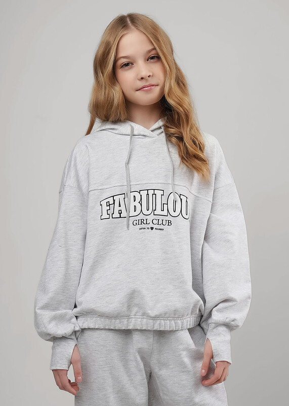 Стильное серое худи оснащено регулируемым капюшоном на шнурке для идеальной посадки.Стильный, тактильно приятный принт украшает переднюю часть изделия. Манжеты из рибаны дополнены отверстием для пальца, что делает модель особенно удобной в носке.