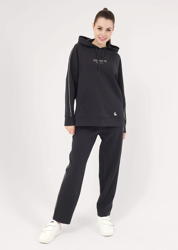Джемпер спортивный из трикотажного полотна, свободного кроя. По горловине капюшон со шнуром. Длинный рукав реглан. По низу рукава и изделия манжет. Спереди карман кенгуру, принт вспенка. По линии плеча и рукаву контрастный кант. На полочке принт.