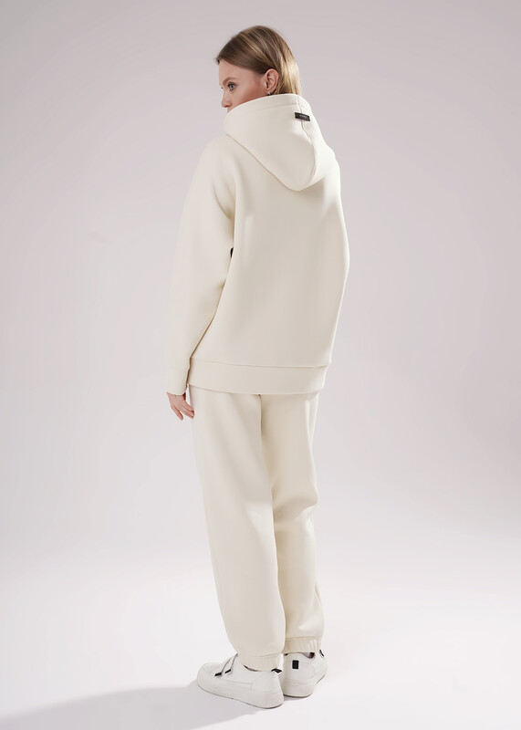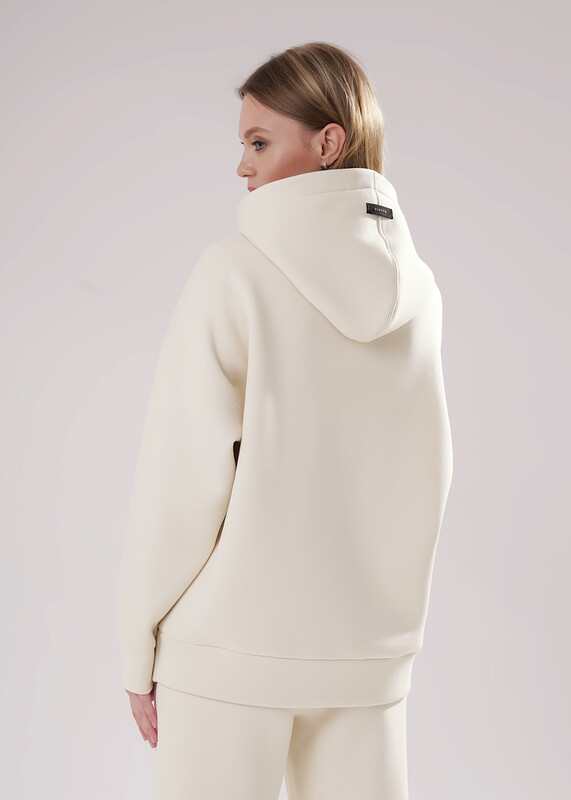 Джемпер спортивный свободного силуэта из трикотажного полотна футер с начесом, с капюшоном на подкладе. Длинный рукав со спущенной линией плеча. По низу рукава и изделия манжеты. Спереди вверху принт, внизу карман кенгуру.