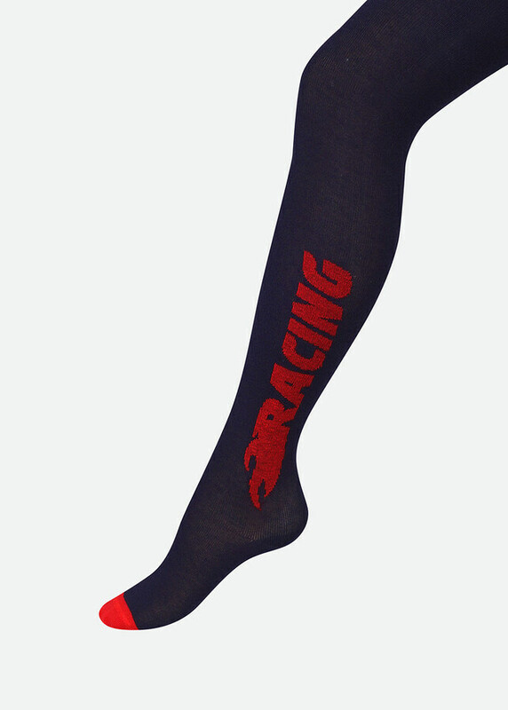 колготки для мальчика с разными рисунками на ножках, на одной ноге полоски, на второй надпись ""гонки"" ,