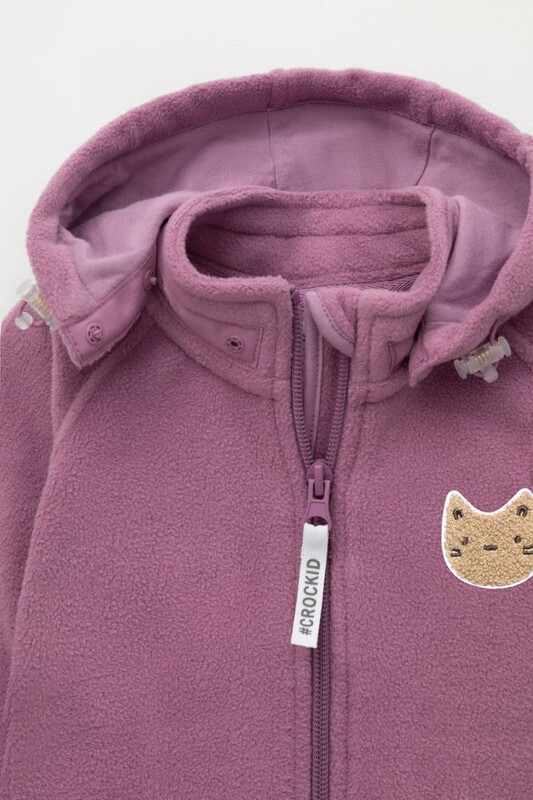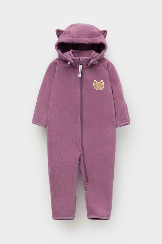 Флисовый комбинезон со съёмным капюшоном для девочки. У изделия высокий воротник и съёмный капюшон на кнопках. Застёгивается на удлинённую молнию. Предусмотрена защита шеи и подбородка. В размерах 40/62 - 48/74 на рукавах и штанинах есть удобные отвороты. Комбинезон сохраняет цвет и форму после многократных стирок.