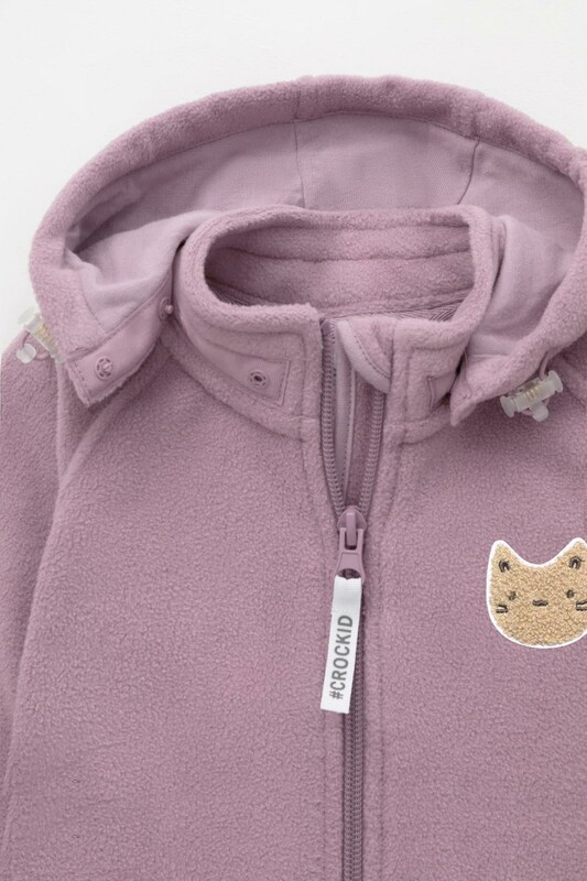 Флисовый комбинезон со съёмным капюшоном для девочки. У изделия высокий воротник и съёмный капюшон на кнопках. Застёгивается на удлинённую молнию. Предусмотрена защита шеи и подбородка. В размерах 40/62 - 48/74 на рукавах и штанинах есть удобные отвороты. Комбинезон сохраняет цвет и форму после многократных стирок.