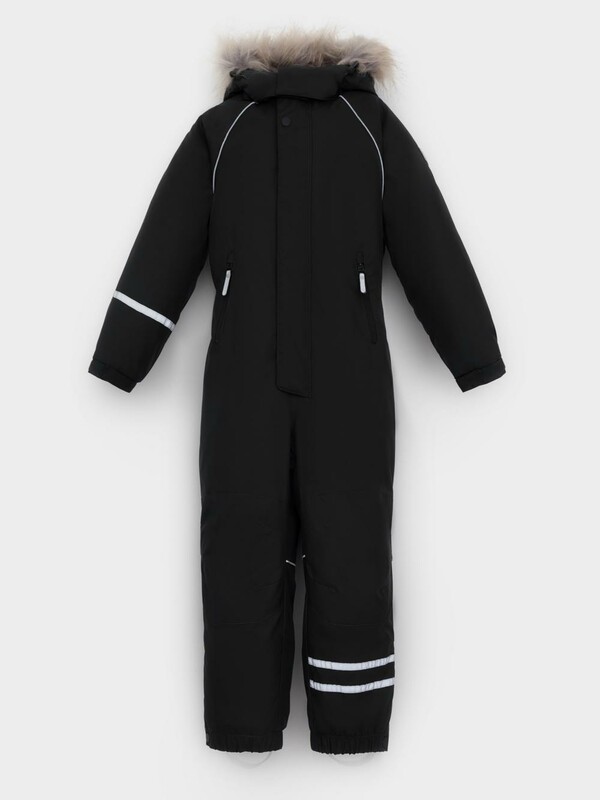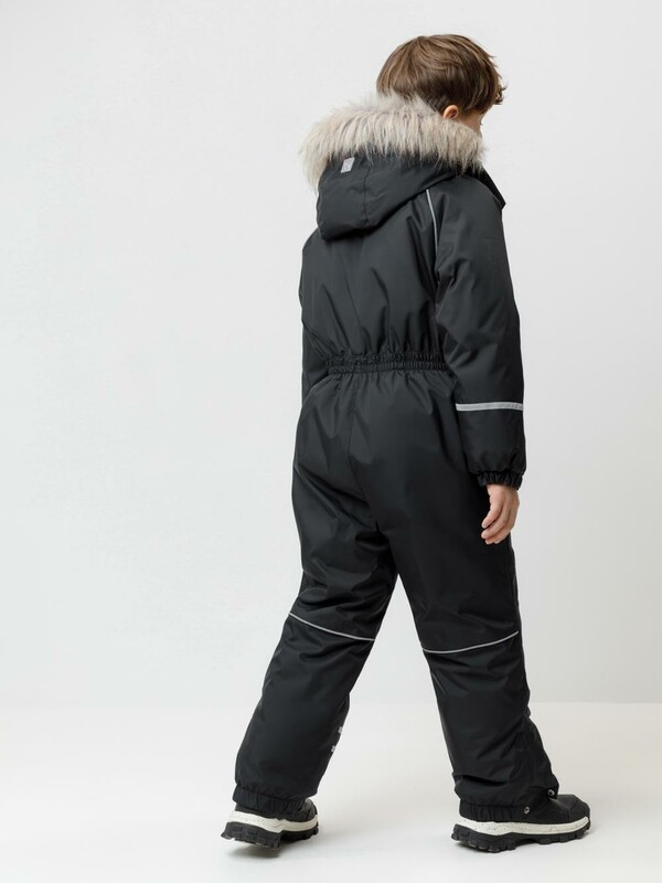Зимний комбинезон для мальчика с утеплителем Fellex®: 250 г/м2 . Выполнен из мембранной ткани с дополнительной тефлоновой обработкой, которая предохраняет изделие от загрязнений и отталкивает влагу. Подклад выполнен из 100% полиэстера Tricot. Комбинезон застёгивается на молнию и внешнюю планку на липучках и кнопках, предусмотрена защита подбородка. Съёмный капюшон имеет эластичную утяжку со стопперами и отстёгивающийся мех на молнии. Резинка по спинке обеспечивает лучшее прилегание. По бокам два кармана на молнии. Эластичные манжеты на рукавах регулируются по ширине с помощью липучки, по низу изделия - с помощью кнопки. Внутренняя противоснежная юбка защищает обувь от попадания снега и удерживает комбинезон в закреплённом положении. В размерах с 98-104 по 116-122 предусмотрены отстёгивающиеся штрипки. Во всех изделиях верхнего ассортимента для безопасности ребёнка предусмотрены светоотражающие элементы.