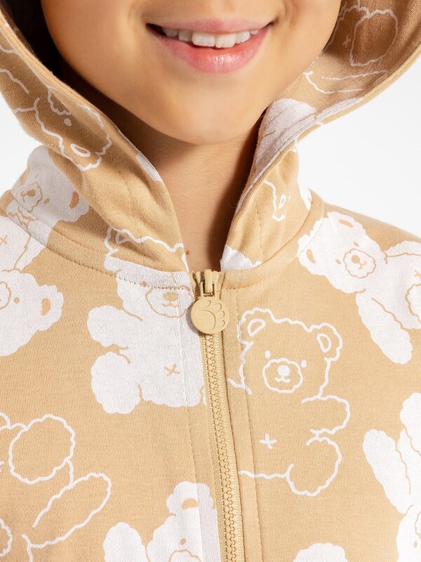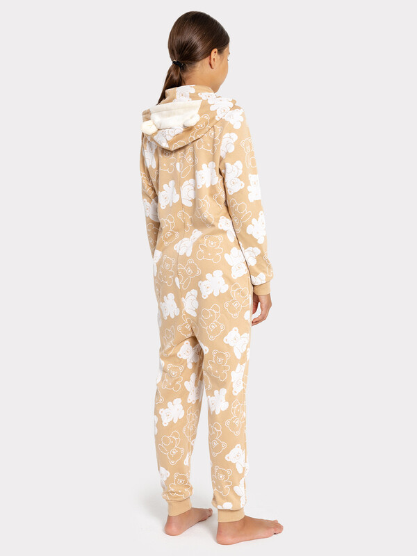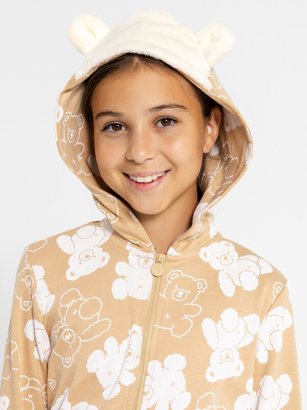 Комбинезон из трикотажного полотна интерлок. Силуэт свободный, на капюшоне – декоративные ушки из искусственного меха. Застегивается на центральную молнию. Рукава длинные, на манжетах из рибаны, как и штанины. Такой конфортный и очаровательный комбинезон, что ваша девочка не захочет его снимать!