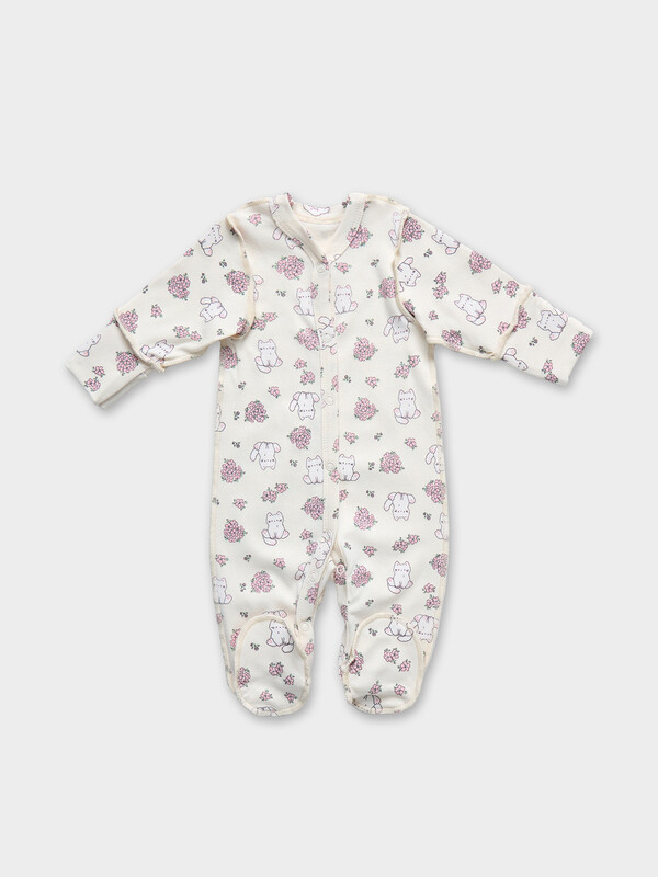 Цельнокроенная спинка и удобная застежка на кнопках от горловины до низа упрощают смену подгузника. Рукава и горловина аккуратно обработаны мягкой бейкой, которая нежно прилегает к телу. Дополнительная ластовица в шаговом шве и следы с отрезной верхней частью обеспечивают удобство и защиту.