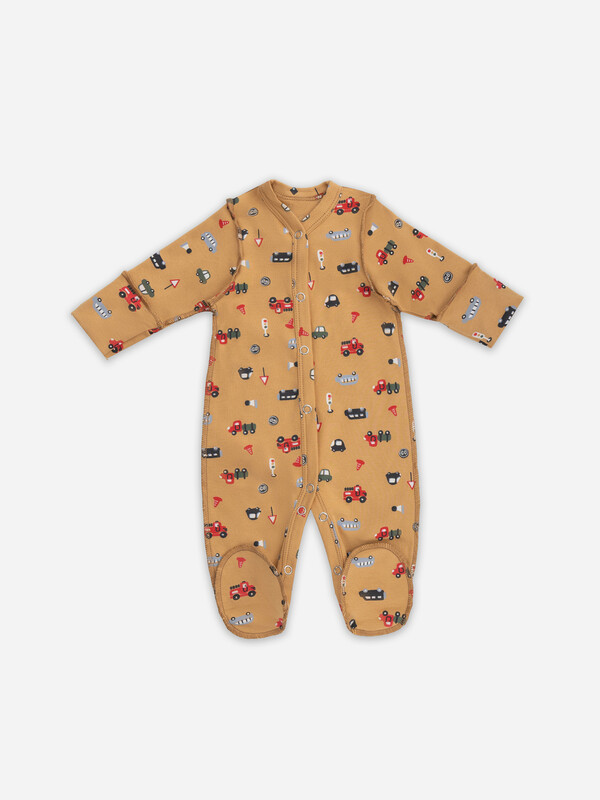 Цельнокроенная спинка и удобная застежка на кнопках от горловины до низа упрощают смену подгузника. Рукава и горловина аккуратно обработаны мягкой бейкой, которая нежно прилегает к телу. Дополнительная ластовица в шаговом шве и следы с отрезной верхней частью обеспечивают удобство и защиту.
