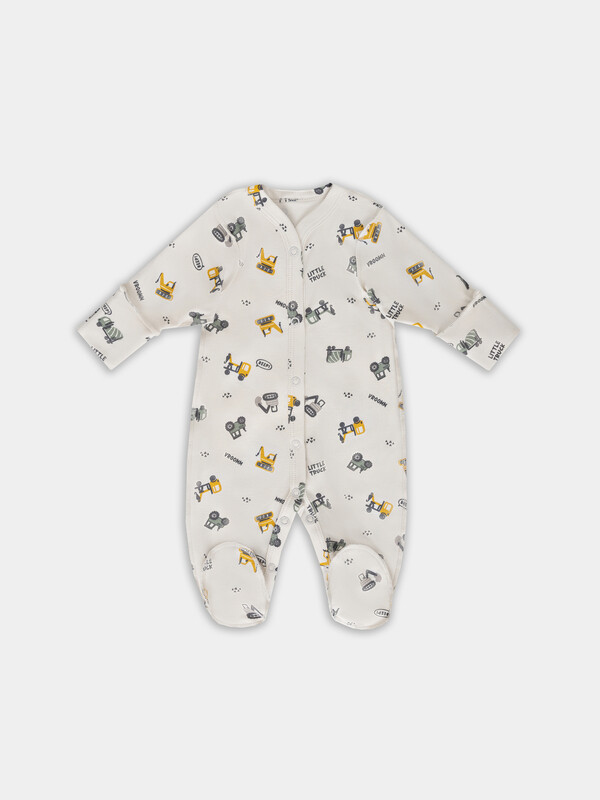 Цельнокроенная спинка и удобная застежка на кнопках от горловины до низа упрощают смену подгузника. Рукава и горловина аккуратно обработаны мягкой бейкой, которая нежно прилегает к телу. Дополнительная ластовица в шаговом шве и следы с отрезной верхней частью обеспечивают удобство и защиту.