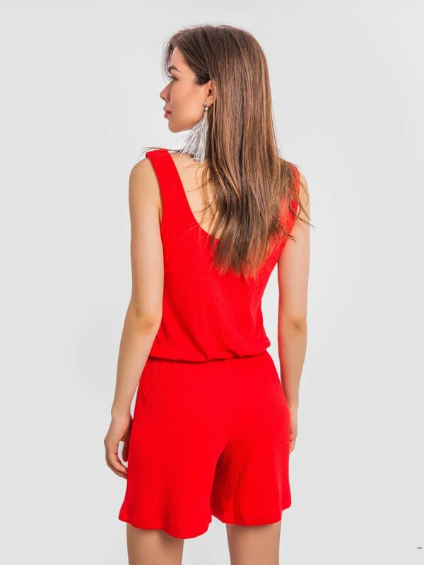 Легкий комбинезон из трикотажного полотна с фактурой "рибана" отлично подходит для долгих прогулок и вылазок на природу. Свободный низ в виде просторных шорт и неглубокий, но эффектный вырез на спине обращают на себя внимание.
