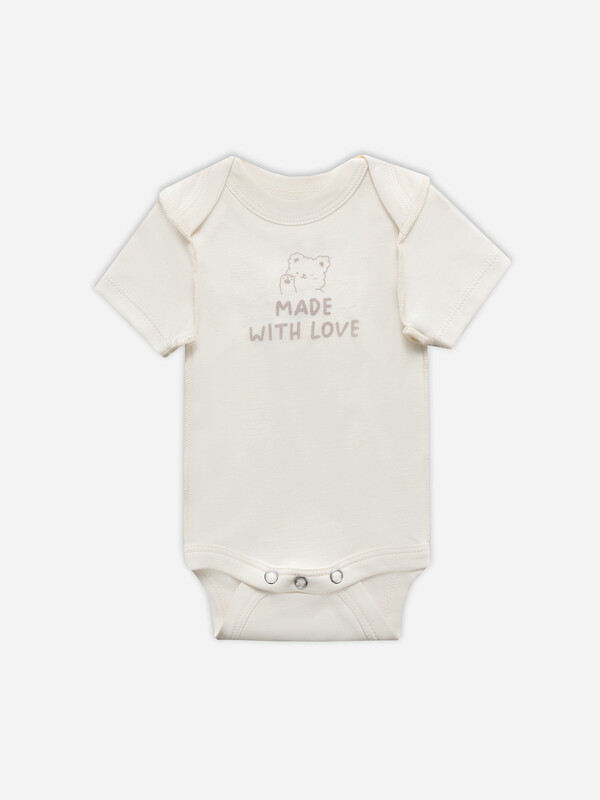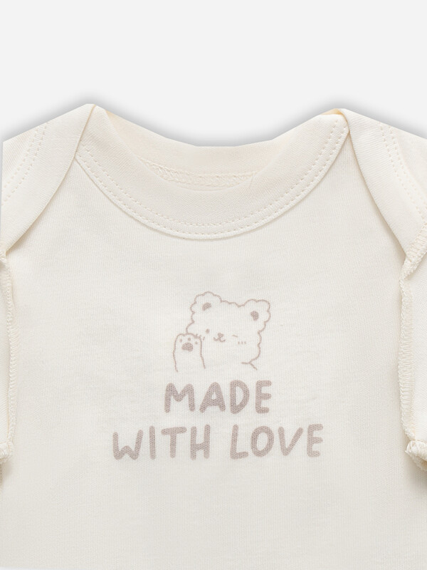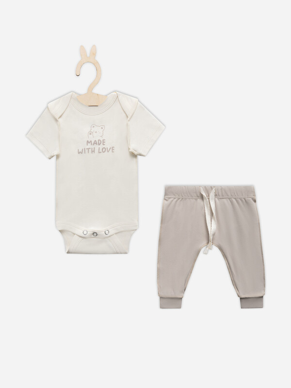 Комплект состоит из боди и ползунков для 1-3 месяцев (рост 56-62),выполнено из интерлока. Швы на лицевой стороне изделия Боди выполнено из интерлока. Спинка и перед цельнокроенны. Спинка с переходящей кокеткой и цельнокроенной ластовицей. Горловина круглая, окантована бейкой из основног полотна. Припуски верхних и нижних срезов переда и спинки окантованы бейкой из основго полотна. Рукава короткие, втачные, одношовные.