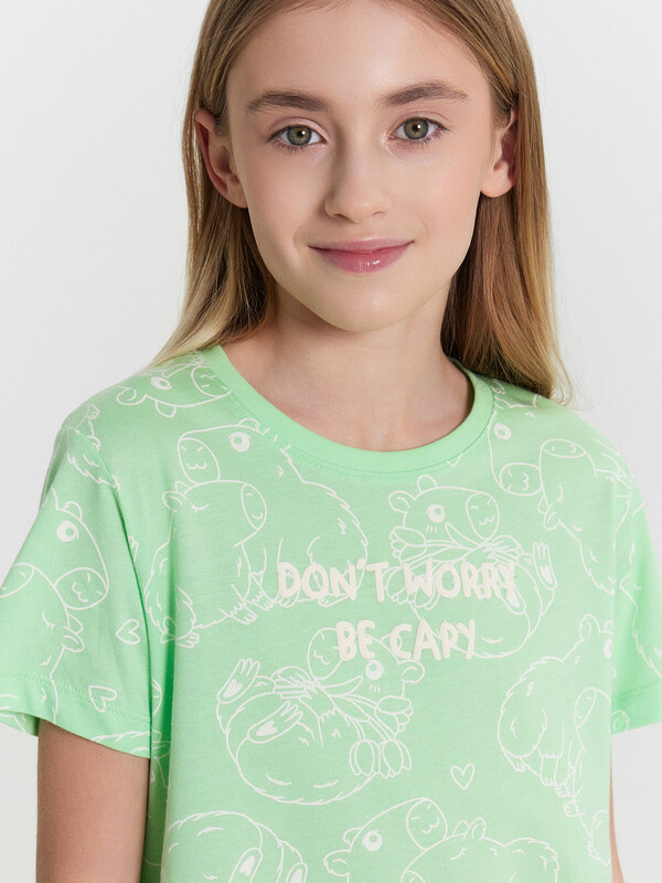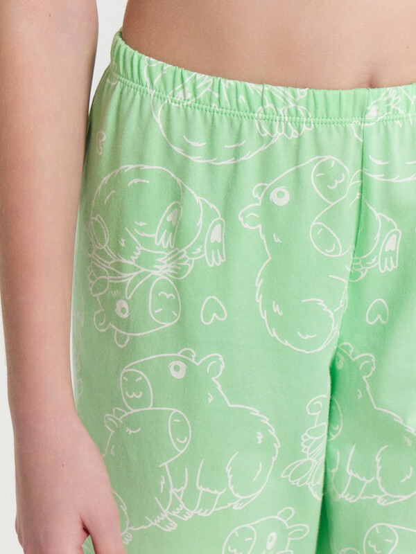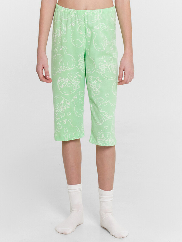 Пижама для девочек, выполненная из нежной хлопковой кулирки, обеспечит вашему ребенку комфорт и уют в течение всей ночи. Свободная футболка с короткими рукавами и круглой горловиной не сковывает движения и создаёт ощущение легкости. Бриджи прямого силуэта длиной чуть ниже колена с эластичным поясом обеспечат удобную посадку и свободу движений. Этот комплект станет прекрасным выбором для комфортного сна и отдыха.