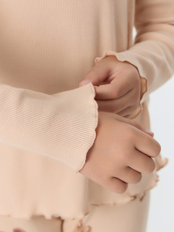 Горловина круглой формы обработана обтачкой из основного полотна. Рукава длинные втачные. Перед и спинка цельнокроеные. Низ джемпера и рукавов обработан на микрооверлоке.