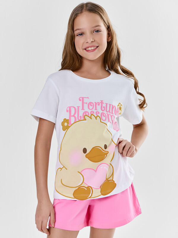 Комплект для девочки, состоит из футболки с короткими рукавами и шорт из натурального хлопка. Подходит для сна и отдыха. Материал очень приятный к телу, хорошо пропускает воздух, что позволяет чувствовать себя комфортно даже в жаркую погоду. Идеальный выбор детской одежды для дома. Стильно, красиво, комфортно. Футболка декорирована интересным принтом, шортики однотонные. Широкий размерный ряд, базовые и яркие расцветки, модели с принтами, рисунками и печатями. Купите детскую пижаму для девочки от Mark Formelle, порадуйте ребенка красивым и стильным подарком!