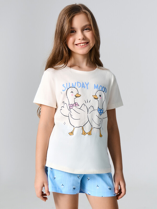 Пижама для девочек — идеальное сочетание комфорта и легкости для спокойного сна. Футболка свободного кроя с круглой горловиной и короткими рукавами обеспечивает удобную посадку, позволяя двигаться без ограничений. Она не сковывает движения и дарит ощущение мягкости благодаря натуральному материалу. Шорты длиной до колен с эластичным поясом мягко прилегают к телу, гарантируя комфорт и свободу движений. Их свободный крой делает пижаму универсальным вариантом для теплых ночей и домашнего отдыха. Выполненный из трикотажной кулирки комплект приятен к коже, воздухопроницаем и обеспечивает уютную атмосферу для сна. Отличный выбор для спокойных ночей, дарящий мягкость, удобство и приятные ощущения!