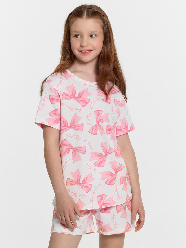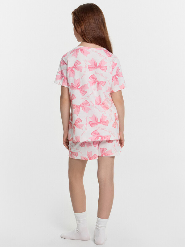 Пижама для девочек. Выполнена из трикотажной кулирки. Состоит из футболки и шортиков. Футболка свободная, с круглой горловиной, короткими рукавами. Шорты свободные, длиной до колен, пояс с эластичной тесьмой внутри. В такой пижамке сны будут действительно приятными!