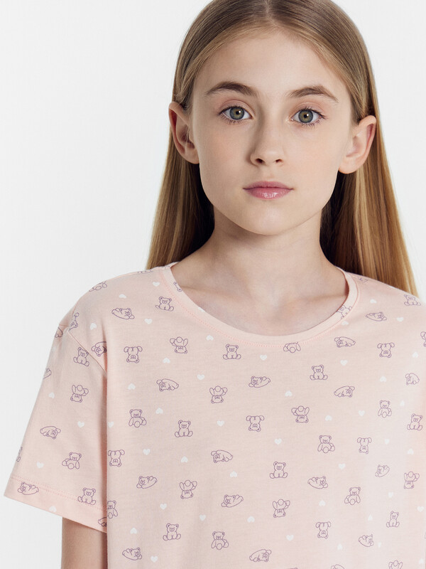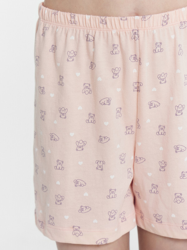 Пижама для девочек. Выполнена из трикотажной кулирки. Состоит из футболки и шортиков. Футболка свободная, с круглой горловиной, короткими рукавами. Шорты свободные, длиной до колен, пояс с эластичной тесьмой внутри. В такой пижамке сны будут действительно приятными!