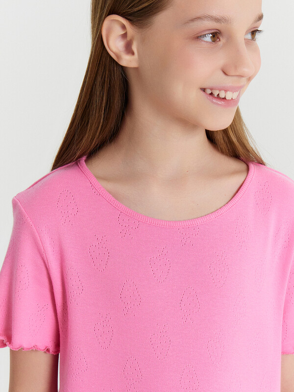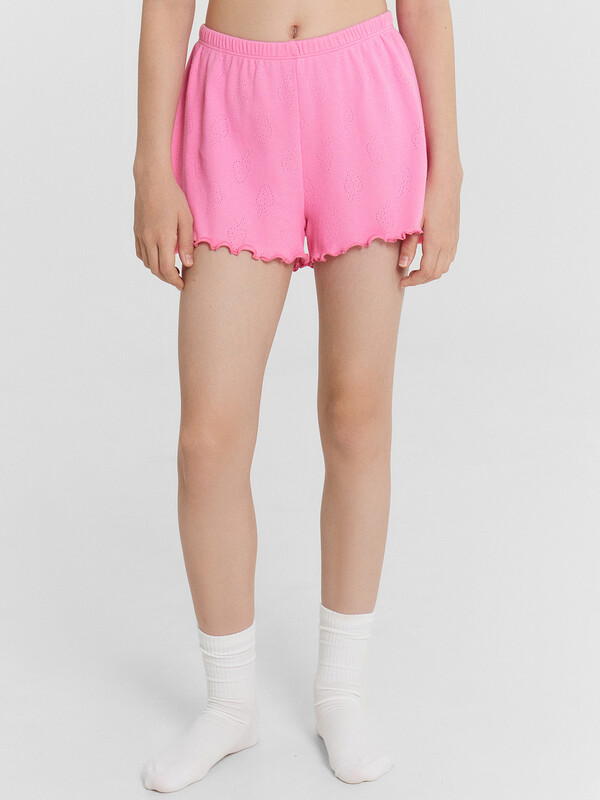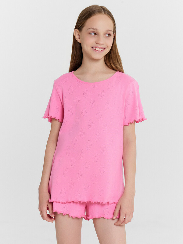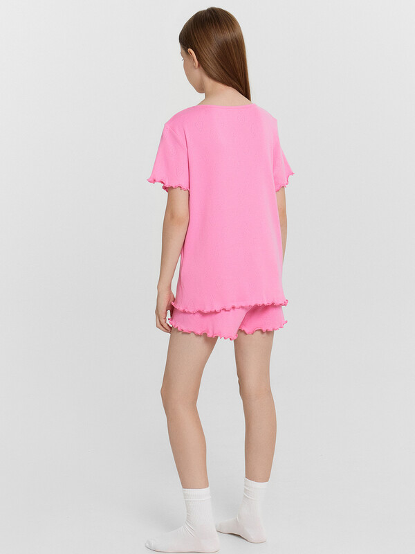 Комплект состоит из футболки и шорт. Футболка прямого силуэта. Перед и спинка цельнокроенные. Горловина круглая окантована бейкой из основного полотна. Низ рукавов и изделия обработаны микрооверлоком. Шорты прямого силуэта. Пояс цельнокроенный с эластичной тесьмой внутри. Низ изделия обработан микрооверлоком.