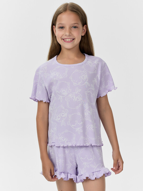 Домашний комплект для девочек — уютный и стильный выбор для комфортного отдыха и сна. Футболка прямого силуэта с круглой горловиной обеспечивает удобную посадку и свободу движений, а ее лаконичный крой делает модель универсальной. Шорты прямого силуэта с эластичной талией мягко прилегают к фигуре, обеспечивая комфорт в течение всего дня. А нежная рюша по нижнему краю добавляет очаровательный акцент, делая комплект более изящным. Выполненный из натурального хлопка, комплект приятен к коже, воздухопроницаем и обеспечивает уютные ощущения. Прекрасный вариант для домашнего гардероба, сочетающий удобство, стиль и нежные детали!