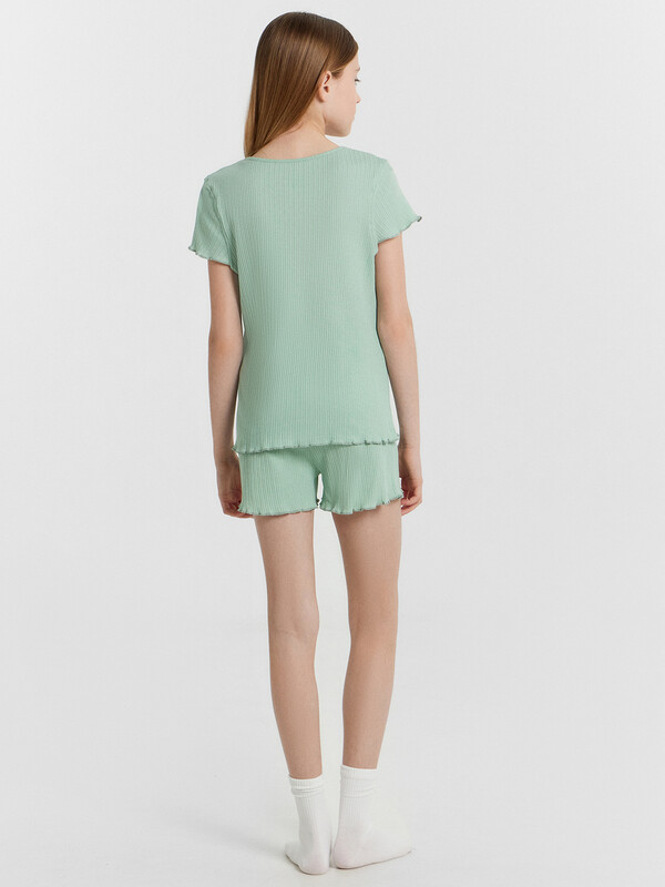 Комплект состоит из футболки и шорт. Футболка прямого силуэта. Перед и спинка цельнокроенные. Горловина круглая окантована бейкой из основного полотна. Низ рукавов и изделия обработаны микрооверлоком.