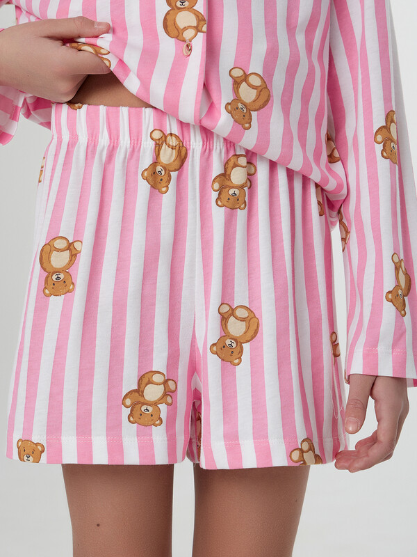 Короткие шорты со средней посадкой талии. Пояс цельнокроеный с эластичной тесьмой внутри (внутрення резина 30RV), ширина 30 мм. Низ рубашки и шортов обработаны на 2-х игольной плоскошовной машине швом в подгибку.