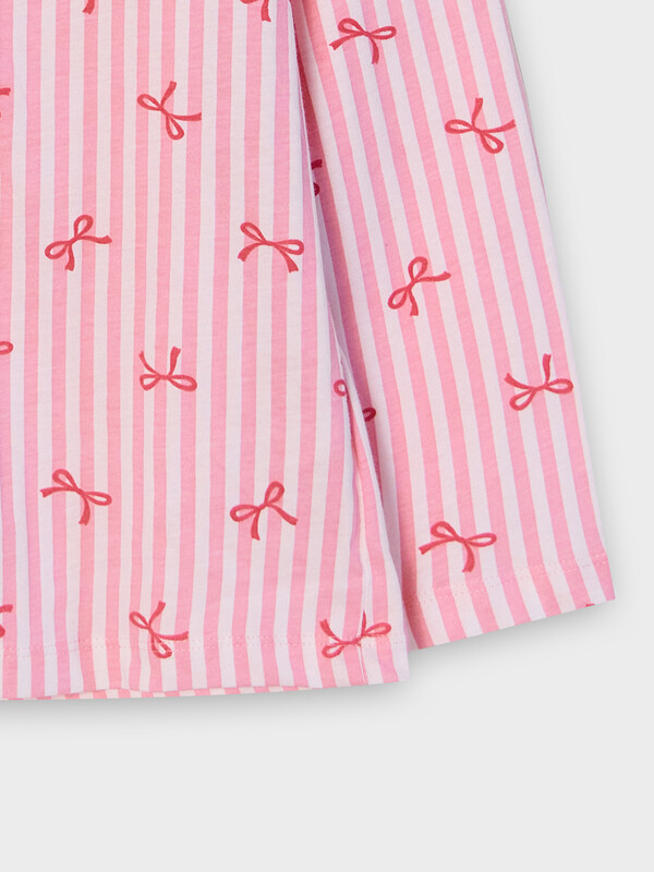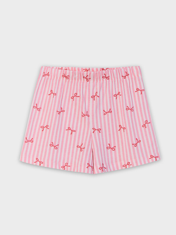 Короткие шорты со средней посадкой талии. Пояс цельнокроеный с эластичной тесьмой внутри (внутрення резина 30RV), ширина 30 мм. Низ рубашки и шортов обработаны на 2-х игольной плоскошовной машине швом в подгибку.