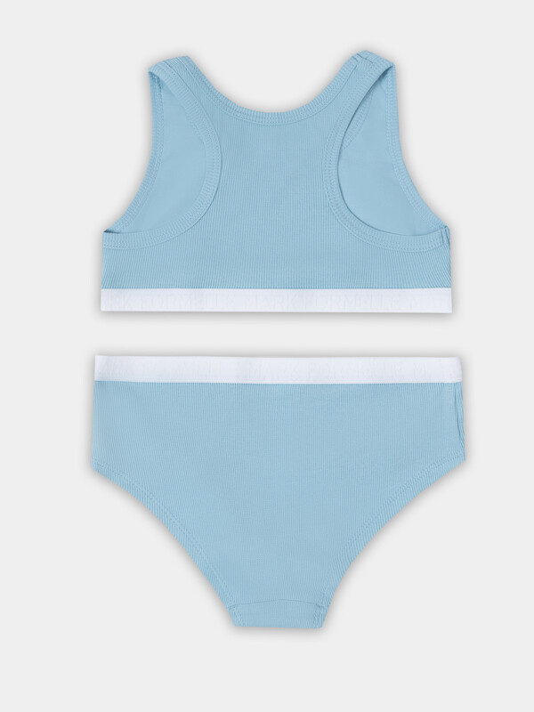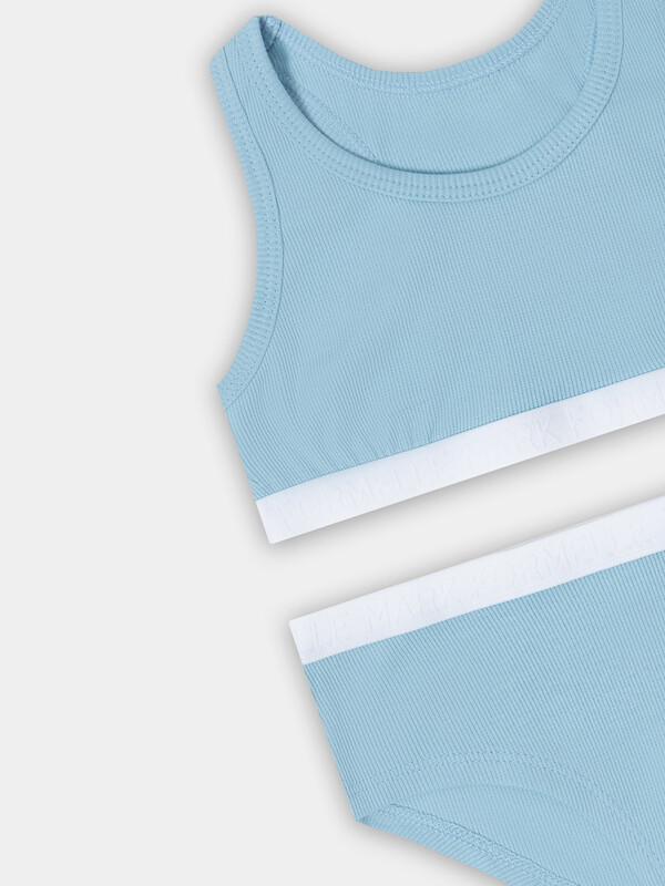 Комплект состоит из топа и трусов. Топ с боковыми швами. Горловина круглой формы. Спинка фигурная, как в спортивном топе. Подкладка по внутренней части переда из кулирного полотна SJ-6 (SJ-009.01.170),95% хлопок; 5% эластан , 180 см, 170 гр/м?. Горловина и пройма окантованы бейкой из основного полотна. По нижнему срезу топа настрочена эластичная тесьма (тесьма жаккард JT1-25), ширина - 25 мм.