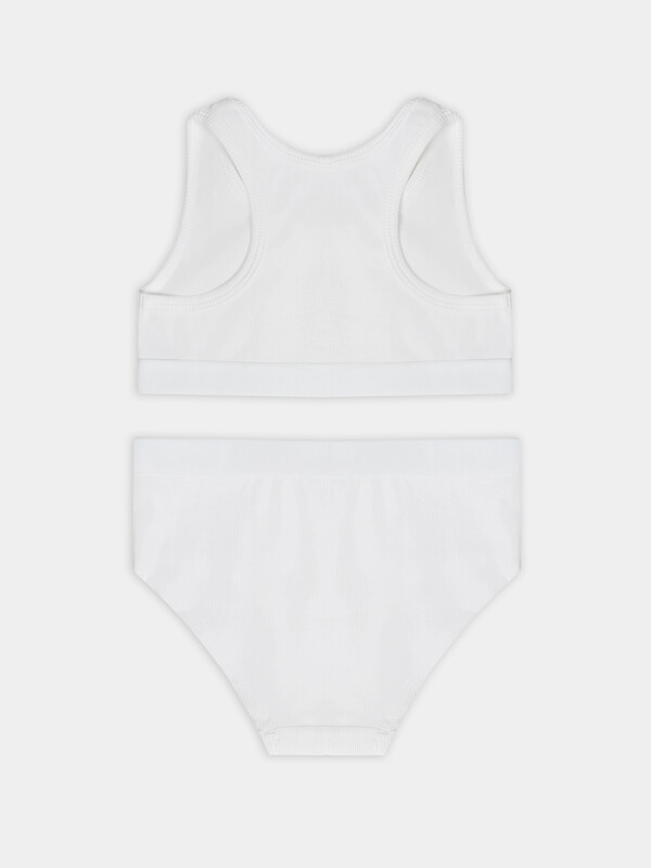 Детский комплект нижнего белья для девочки состоит из удобного топа и трусиков. Топ с круглой горловиной и фигурной спинкой, как в спортивных моделях, обеспечивает комфортную поддержку. Внутренняя подкладка из мягкого хлопка с добавлением эластана не раздражает кожу. Эластичная жаккардовая тесьма по нижнему срезу топа и горловине обеспечивает аккуратную посадку без сдавливания.