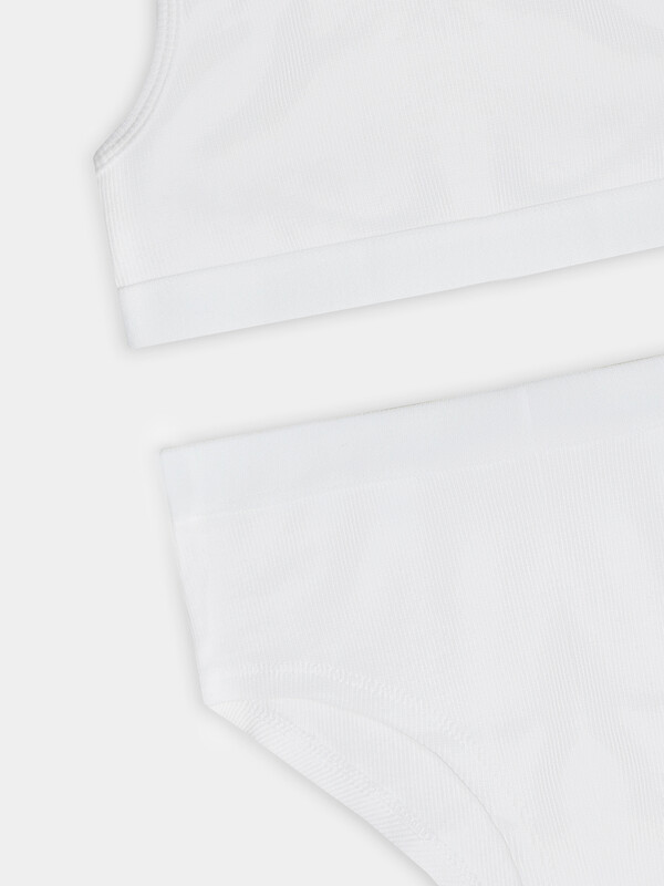 Трусики выполнены из того же дышащего материала, что и топ. Мягкая обработка швов предотвращает натирание, а эластичная тесьма по верхнему краю надежно фиксирует изделие. Комплект нижнего белья для девочки подходит для повседневной носки, занятий спортом или отдыха.